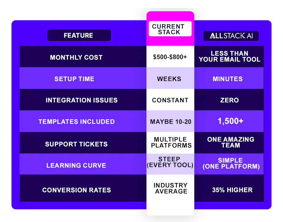 Stop the integration nightmares. AllStack AI gives you unlimited everything- unlimited funnels, websites, email marketing, course creation, membership sites, and 1,500+ proven templates-conversion-tested templates that work together flawlessly. all for less than you're currently paying for just email marketing